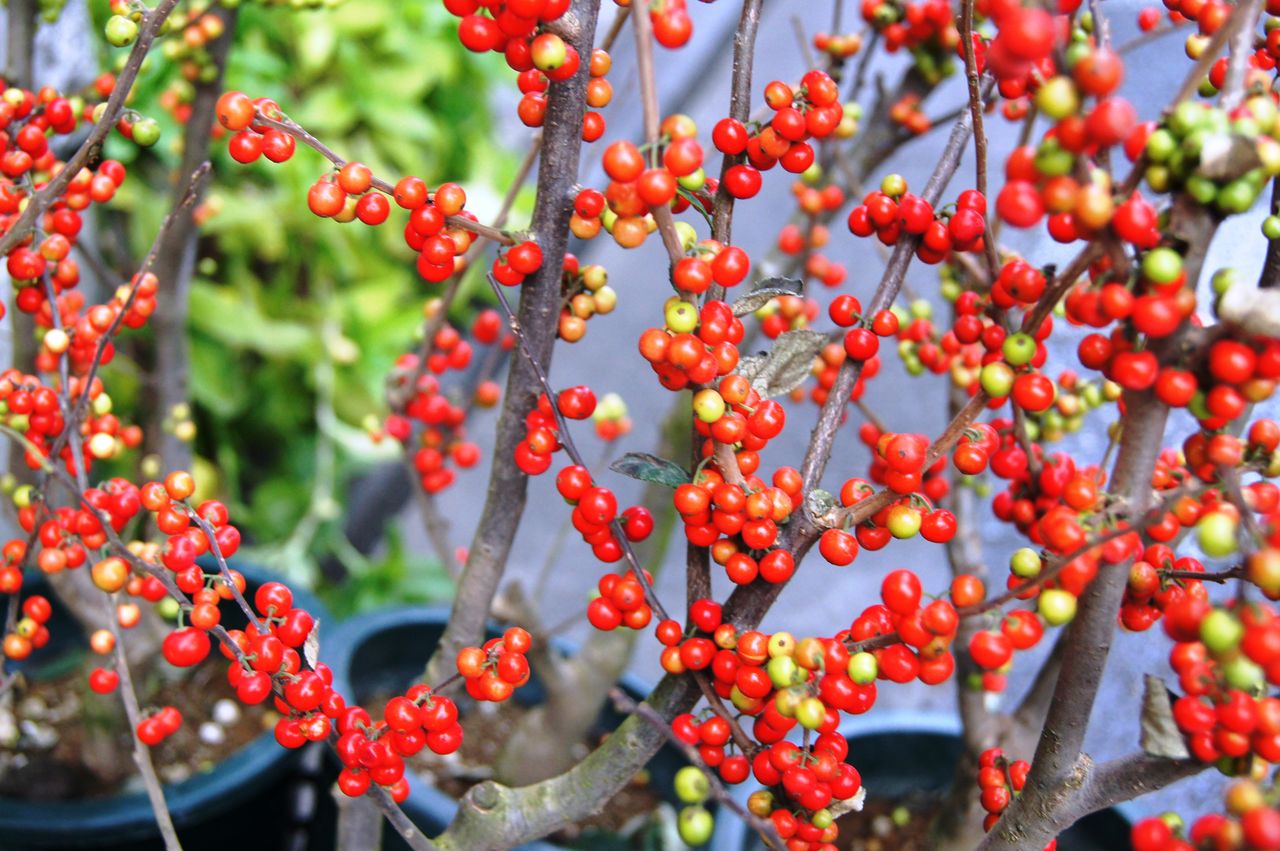 写真のウメモドキはまだ緑の部分が残りますが、これから気温が下がり出すにつれて