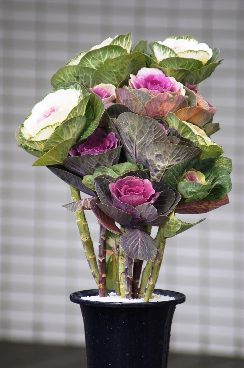 ポット植えの葉牡丹苗から尺鉢大仕立てのハボタン鉢まで